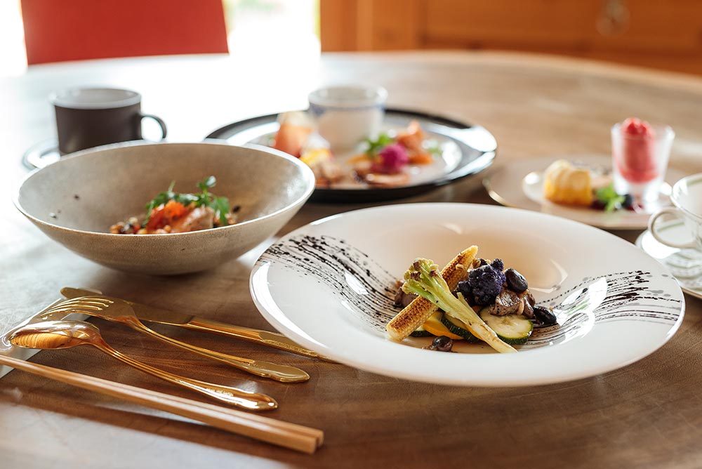 京都の料理店で腕を磨いたオーナーが、心を込めてお料理をご用意します。お食事は、宿泊コテージに隣接するレストラン棟で、愛犬と一緒にゆっくりお楽しみいただけます。ご希望があれば、お部屋でのお食事も可能ですのでお気軽にご相談ください。