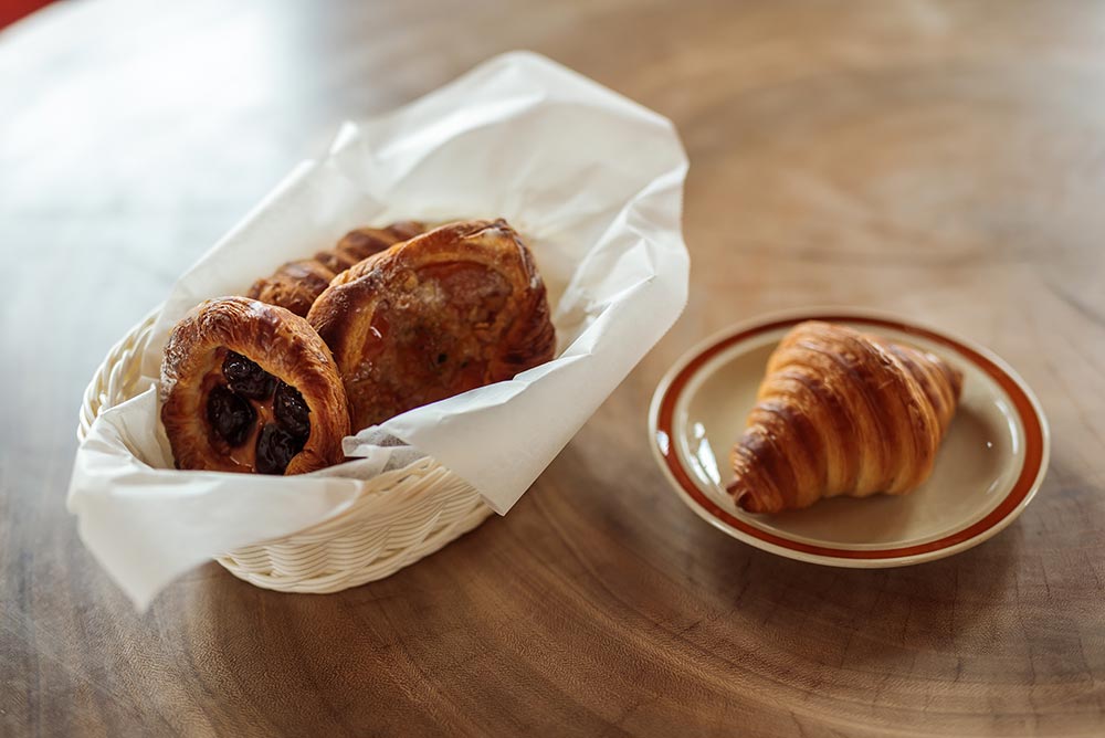 スパニッシュオムレツにミネストローネ、香ばしいパンと果物のデニッシュ、そして美麻珈琲や大町産りんごジュースまで。