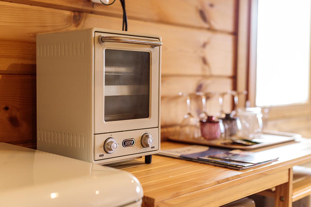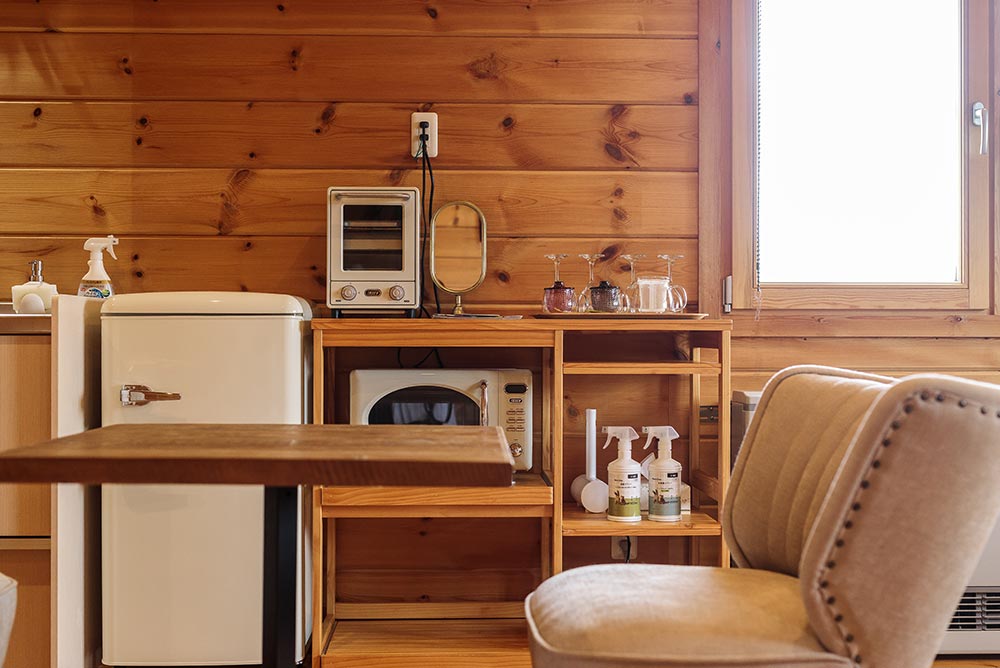 一棟貸し(45m2)のコテージは、リビングキッチン + 寝室 + 庭付きの1LDKタイプ。最大5名様までお泊まりできます。食材や調味料を持ち込んでの調理も可能。また事前のご予約でお食事の用意もできます。